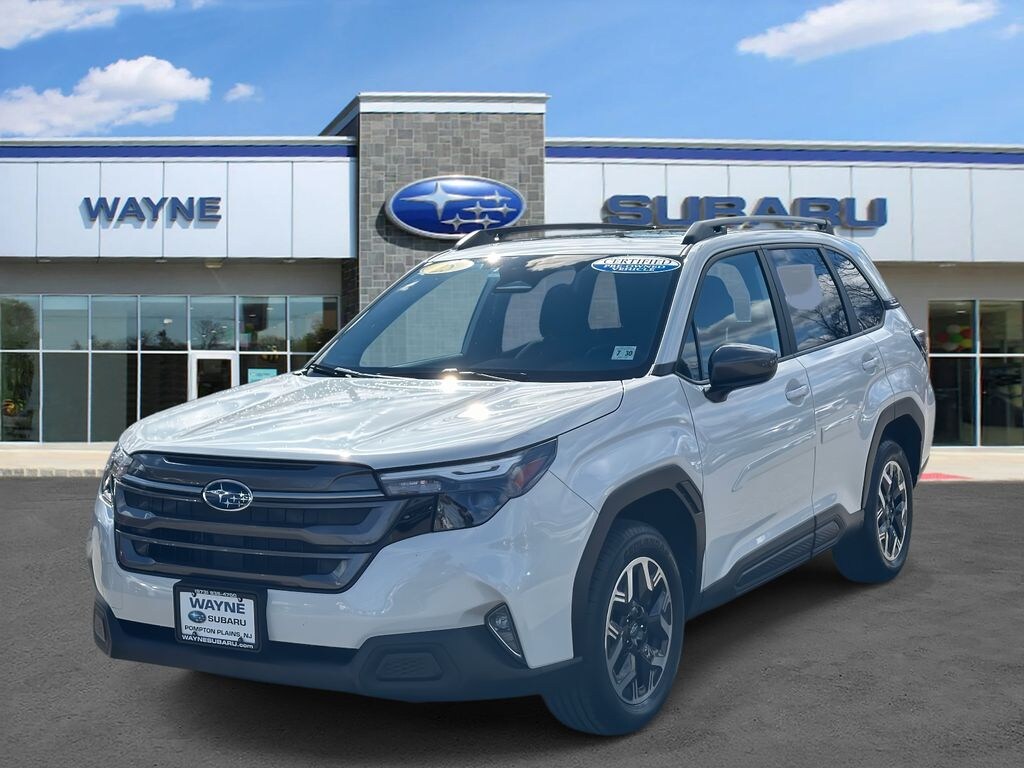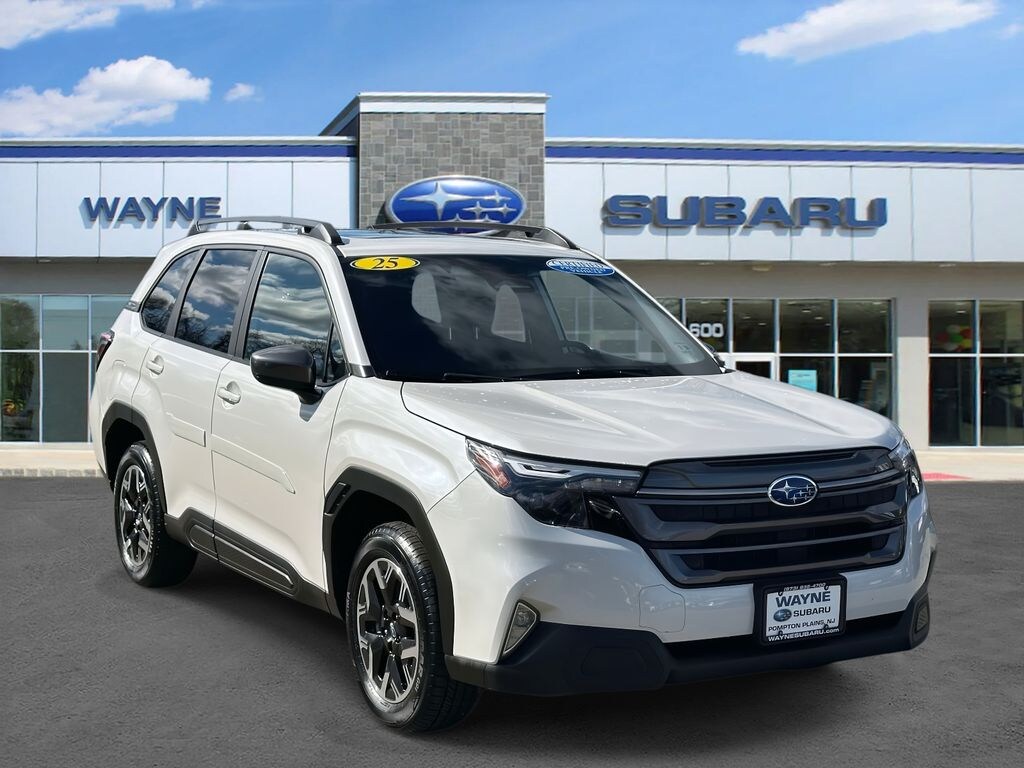 Wayne Subaru is proud to present you with another True Market Priced Pre-Owned Vehicle. This 2025 Subaru Forester Premium Subaru Certified Pre-Owned is loaded with the following Factory Options: Subaru Certified Pre-Owned Certified, 4-Wheel Disc Brakes, 6 Speakers, ABS brakes, Air Conditioning, Alloy wheels, AM/FM radio: SiriusXM with 360L, Anti-whiplash front head restraints, Auto High-beam Headlights, Automatic temperature control, Brake assist, Bumpers: body-color, Driver door bin, Driver vanity mirror, Dual front impact airbags, Dual front side impact airbags, Electronic Stability Control, Emergency communication system: MySubaru Safety (3-year free trial), Exterior Parking Camera Rear, Four wheel independent suspension, Front anti-roll bar, Front Bucket Seats, Front Center Armrest, Front dual zone A/C, Front fog lights, Front reading lights, Fully automatic headlights, Heated door mirrors, Heated Front Bucket Seats, Heated front seats, Illuminated entry, Knee airbag, Leather steering wheel, Low tire pressure warning, Occupant sensing airbag, Outside temperature display, Overhead airbag, Overhead console, Panic alarm, Passenger door bin, Passenger vanity mirror, Power door mirrors, Power driver seat, Power moonroof: Panoramic, Power steering, Power windows, Premium Textured Cloth Upholstery, Radio data system, Radio: Subaru 11.6" Multimedia Plus System, Rear anti-roll bar, Rear seat center armrest, Rear window defroster, Rear window wiper, Remote keyless entry, Security system, Speed control, Speed-sensing steering, Split folding rear seat, Spoiler, Steering wheel mounted audio controls, Tachometer, Telescoping steering wheel, Tilt steering wheel, Traction control, Trip computer, Variably intermittent wipers, and Wheels: 17" x 7.0 J Dark Metallic Aluminum-Alloy!!